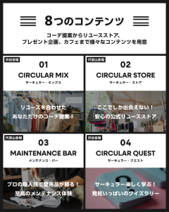 2回目の開催となる当イベントは『楽しむ力が、あしたを変える。』と題し、有名セレクトショップのスタッフによるリユースアイテムを用いたコーディネート提案や、世界トップレベルのメンテナンス・バー、プレゼントがもらえるサーキュラークイズなどが実施されます。